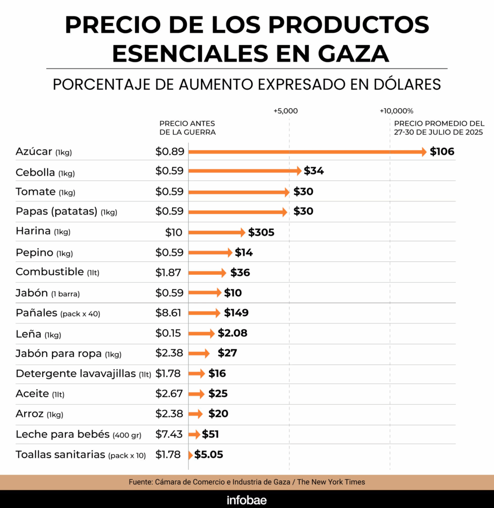 El azúcar cuesta ahora unos 106 dólares por kilogramo, en comparación con los 89 centavos de antes de la guerra; la harina cuesta 12 dólares por kilogramo, en comparación con los 42 centavos, y los tomates cuestan 30 dólares por kilogramo, en comparación con los 59 centavos, según datos publicados esta semana por la Cámara de Comercio e Industria de la Gobernación de Gaza.